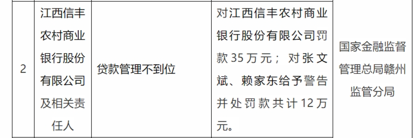 启远网 江西信丰农村商业银行因贷款管理不到位被罚款35万元